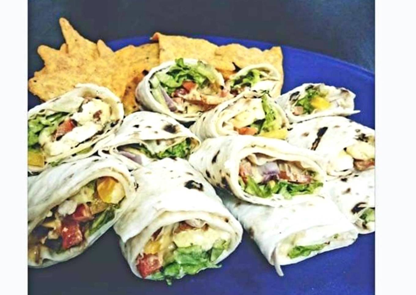 - Now take a tortilla wrap roast it on tawa spread cheese spread on it add letuce leaves paneer pieces and mayonise onion and bell peppers roll it and serve with chips