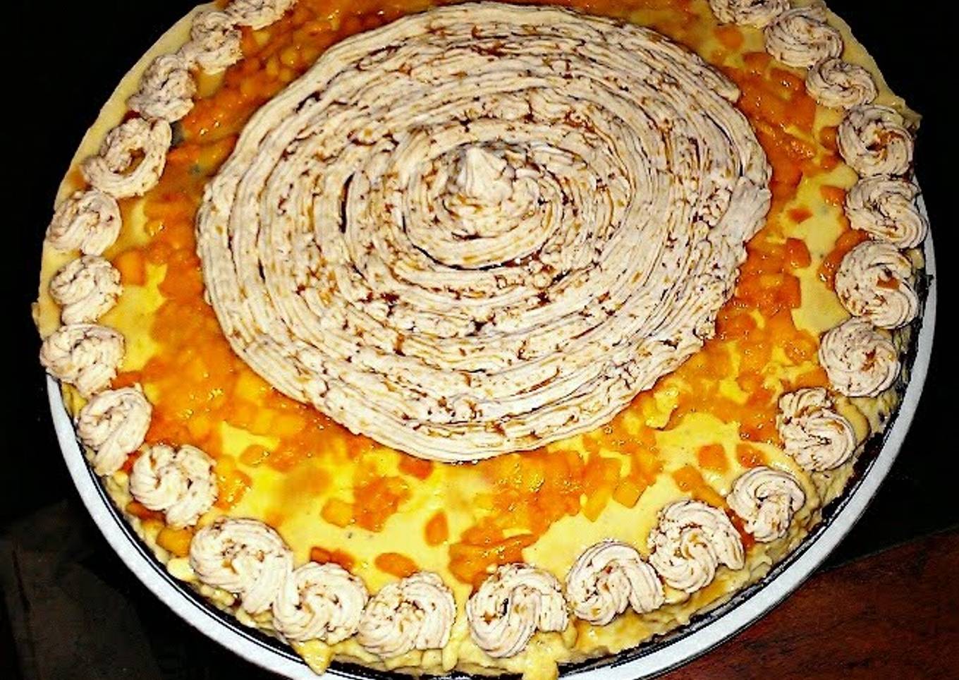 - cut 1 mango in small cubes . spread the cubes over the cake.